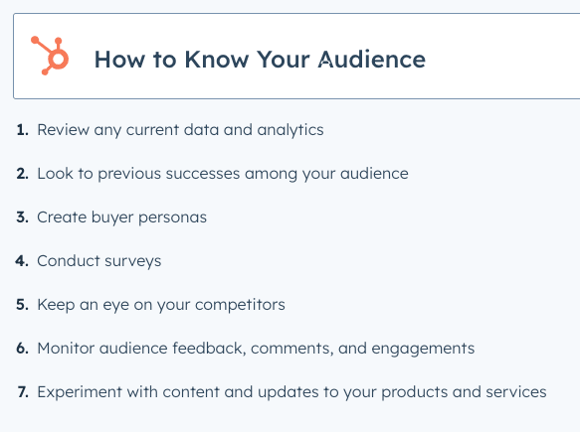Need a little more guidance….According to HubSpot, here is a list of steps you can take to get to know your audience: