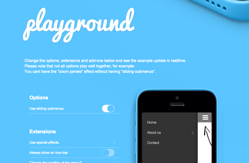The image below shows mmenu's "playground" page. When you visit this page, you can experiment with different options and effects and see a preview of the update before implementing it.