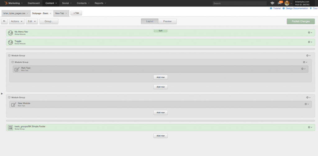 Below, I set up a basic subpage in HubSpot's design manager that you are familiar with.