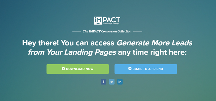 Impact immediately sends you to the Download Now page. Their Ebook which is 31 pages includes social share buttons Facebook, Twitter, and LinkedIn. And as you can see it's on their Thank you page. And Email to your friend!